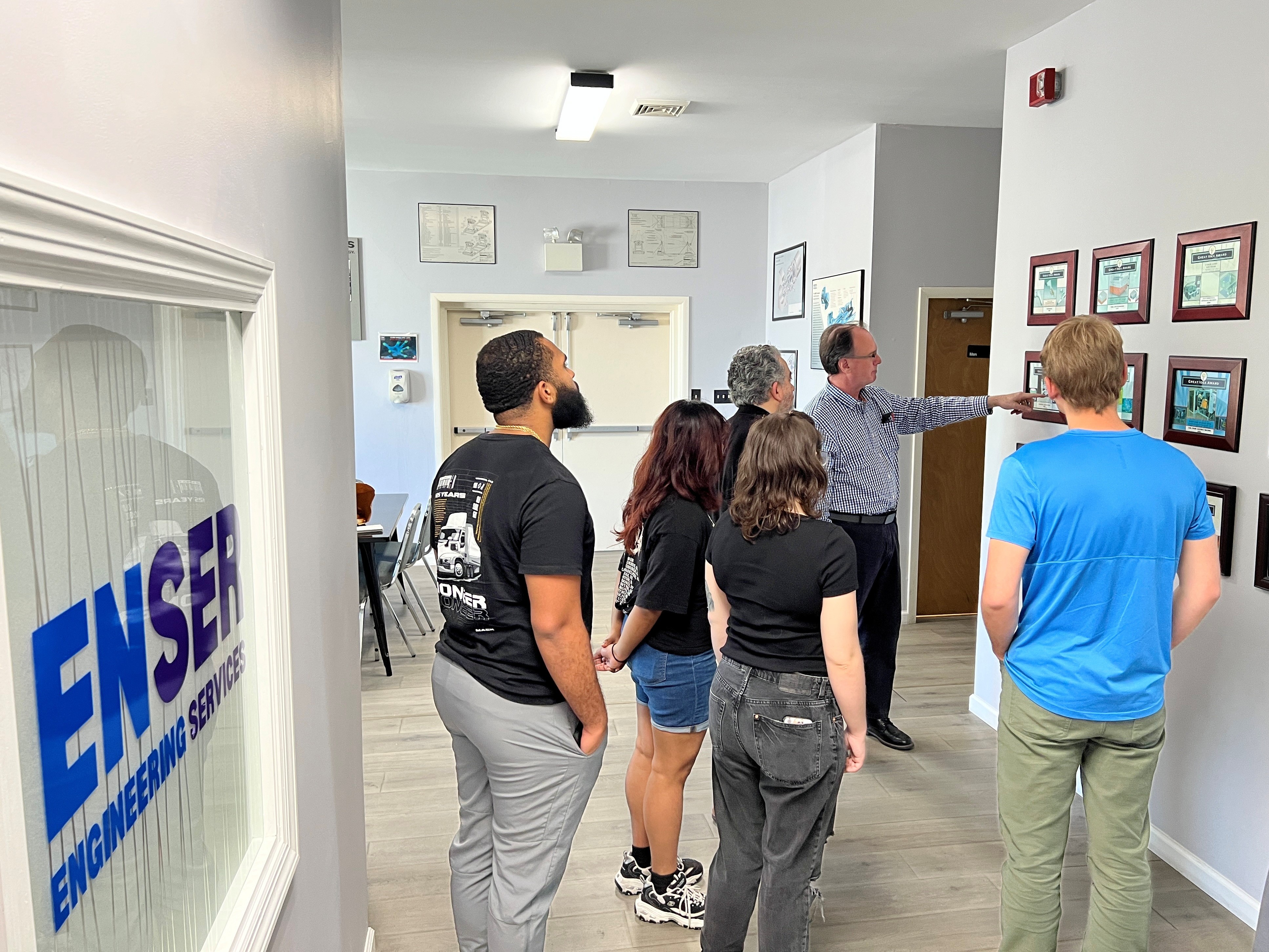 During the visit, Domenic Arnone presented an overview of ENSER’s history, capabilities, and diverse project portfolio. Students learned about ENSER’s work across a wide range of industries and saw examples of how the company supports clients from concept through design, fabrication, testing, and final delivery.